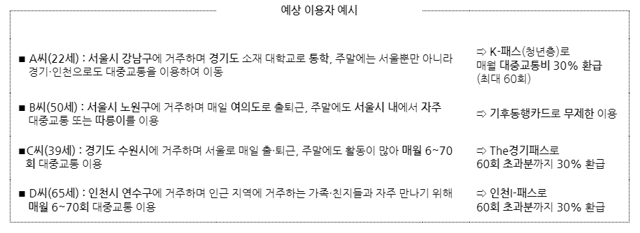 적용 수단 및 범위: 시내버스, 지하철, 광역버스, 민자철도(신분당선 등) 등 교통카드 기반 대중교통 수단 적용,