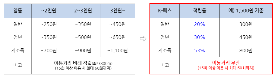 사업 방식: 알뜰교통카드의 이동거리 기준 적립 방식을 없애고 대중교통비 지출액의 정률(계층별 20~53%) 적립 방식으로 개선