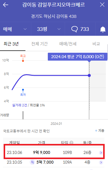 한건이 거래되었으며 109B 기준으로 9억 9천에 거래된 이력이 있습니다.