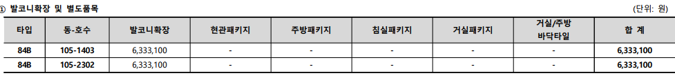 ※ 발코니 확장 및 별도품목(유상), 가전옵션(유상)은 아파트 공급금액에 포함되어 있지 않으며 본 주택은 동-호수별로 기재한 바와 같이 발코니 확장 및 별도품목(유상), 가전옵션(유상) 공사가 완료되었습니다.