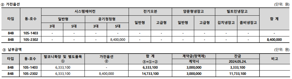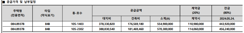 - 공급대상: 84B 105동 1403호, 84B 105동 2302호