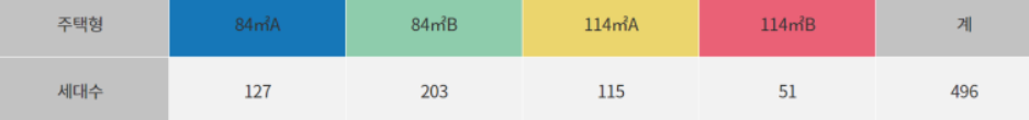 - 주택형: 총 496세대 84 m2A(127세대), 84 m2B(203세대), 114 m2A(115세대), 114 m2B(51세대)