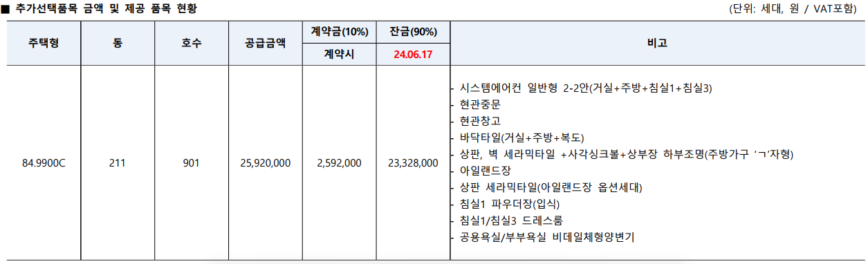 ※ 본 아파트는 최초 계약 당시 선택되었던 발코니 확장 및 추가선택품목 옵션에 따라 자재의 주문, 제작 및 공사가 완료된 관계로 청약자는 위 발코니확장 및 추가선택품목 공급 대금을 추가로 지급할 것을 조건으로 청약이 가능합니다.