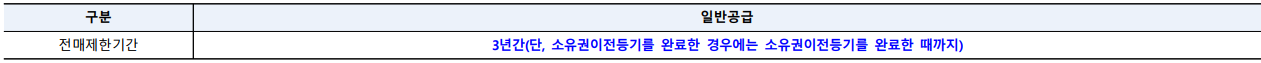 ※ 본 아파트는 최초 입주자로 선정된 날로부터 3년간(단, 소유권이전등기를 완료한 경우에는 소유권이전등기를 완료한 때까지)전매가 금지됩니다. 또한 최초 입주가능일로부터 3년 이내에 입주하여야 하고 3년동안 계속하여 거주할 의무를 부담합니다.