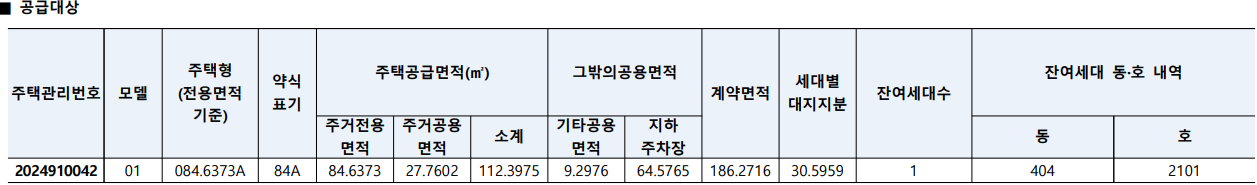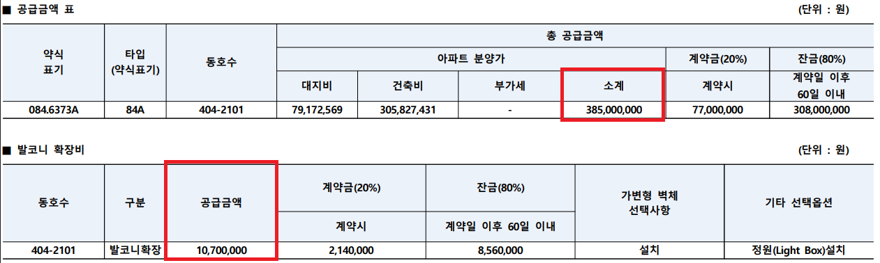 | 84A(404동 2101호) | 385,000,000 | 10,700,000 | 395,700,000 |