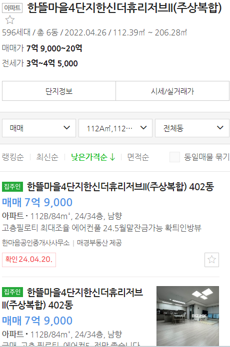 가장 낮은 가격대 매물이 7억 9000에 나와있는 것을 보실 수 있습니다.