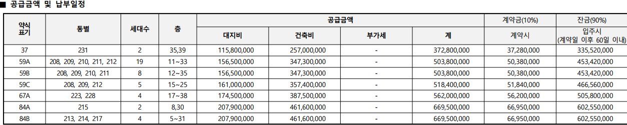 | e편한세상부랑그랑힐스 | 2023년 10월 입주 | 84기준 | 현재 나온 분양가 기준 | 669,500,000 |