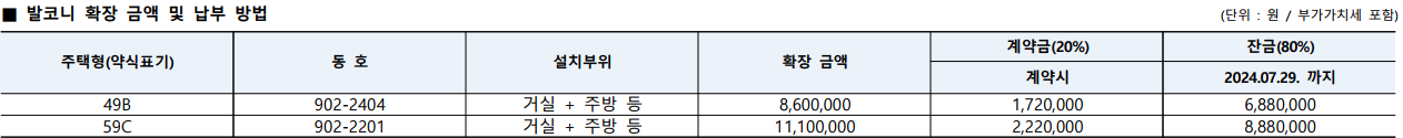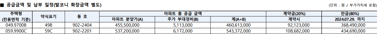 | 주택형(동호수) | 계약금(20%) 계약시 | 잔금(80%) 2024.07.29 | 총 합계 |