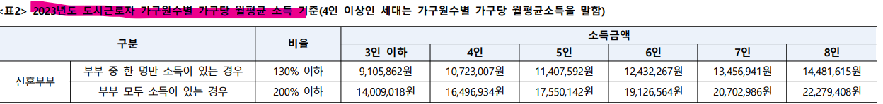 ※ (출산가구 소득기준 완화) ‘23.03.28. 이후 출생한 자녀가 1명인 경우 10%p, 2명 이상인 경우 20%p, ’23.03.28. 이후 출생한 자녀가 1명이고 ’23.03.27. 이전 출생한 자녀가 있는 경우 20%p 가산하여 소득기준이 완화되며, 완화 기준은 아래 “<표2-1> 출산가구 소득기준 완화”를 참고하시기 바랍니다.(단, 완화된 소득 기준을 인정받으려는 분은 출생, 입양, 임신