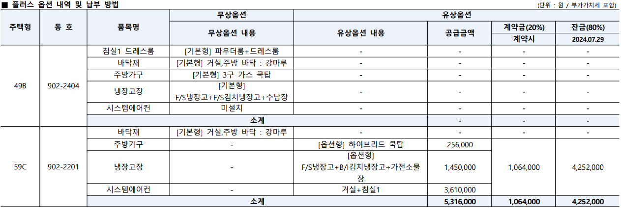 | 주택형(동호수) | 아파트 분양가 | 추가 부대경비 | 발코니 확장 금액 | 플러스 옵션 | 총 합계 |