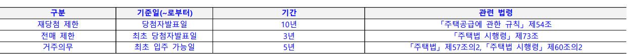 ■ 본 주택은 「공공주택 특별법」에 의한 공공주택 및 「주택법」에 의한 국민주택(전용 85㎡ 이하 주택)이며, 해당 주택건설지역은 대규모 택지개발지구에서 공급하는 분양가상한제 적용 공공주택으로 재당첨제한은 10년 적용되고, 「주택법 시행령」 제73조에 의해 전매제한이 3년 적용되며, 「주택법」 제57조의2 및 「주택법 시행령」 제60조의2 에 의거 거주의무가