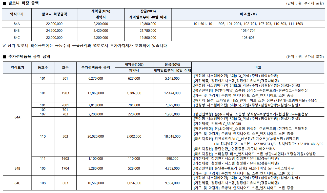 | 주택형 | 동호수 | 아파트 총 공급금액 | 발코니확장금액 | 추가선택품목 금액 | 총 합계 |