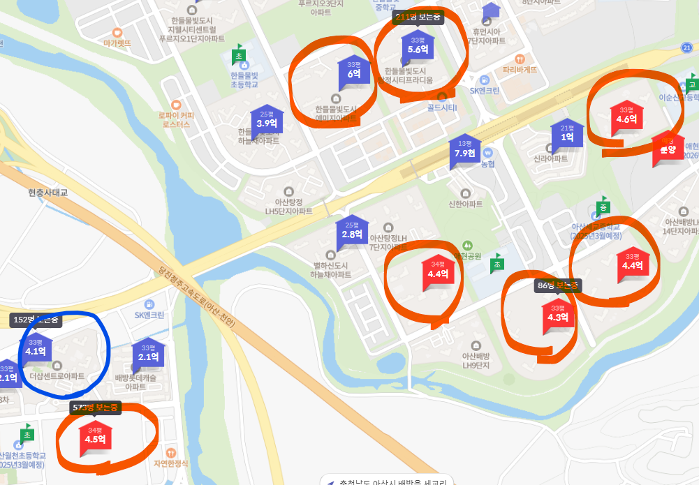 평균 4억도 되지 않습니다. 그러나 빨간색으로 동그라미 친 곳만 비교해봐도