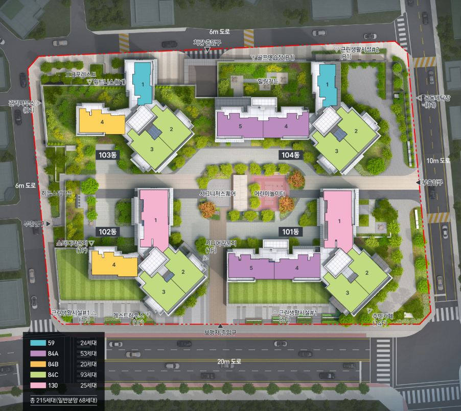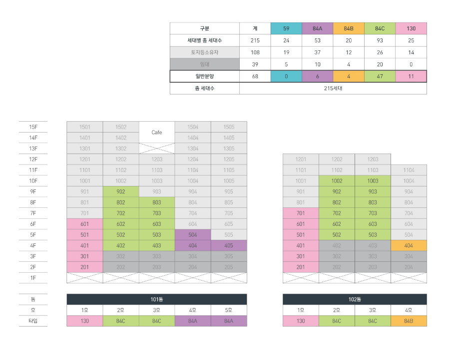 공급규모 : 아파트 지하 2층~지상 10~15층 4개동, 총 215세대(토지등소유자 108세대, 임대 39세대 포함) 중 일반분양 68세대[특별공급 23세대 (기관추천 4세대, 다자녀가구 5세대, 신혼부부 9세대, 생애최초 4세대, 노부모부양 1세대)포함]