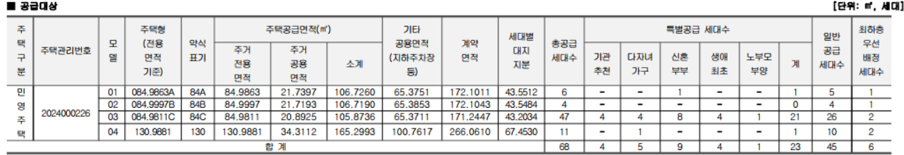 | 주택형 | 특별공급 세대수 | 일반공급 세대수 |