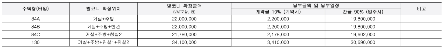 | 주택형 | 최저층 가격 - 최고층 가격 | 발코니확장 | 공급세대 |