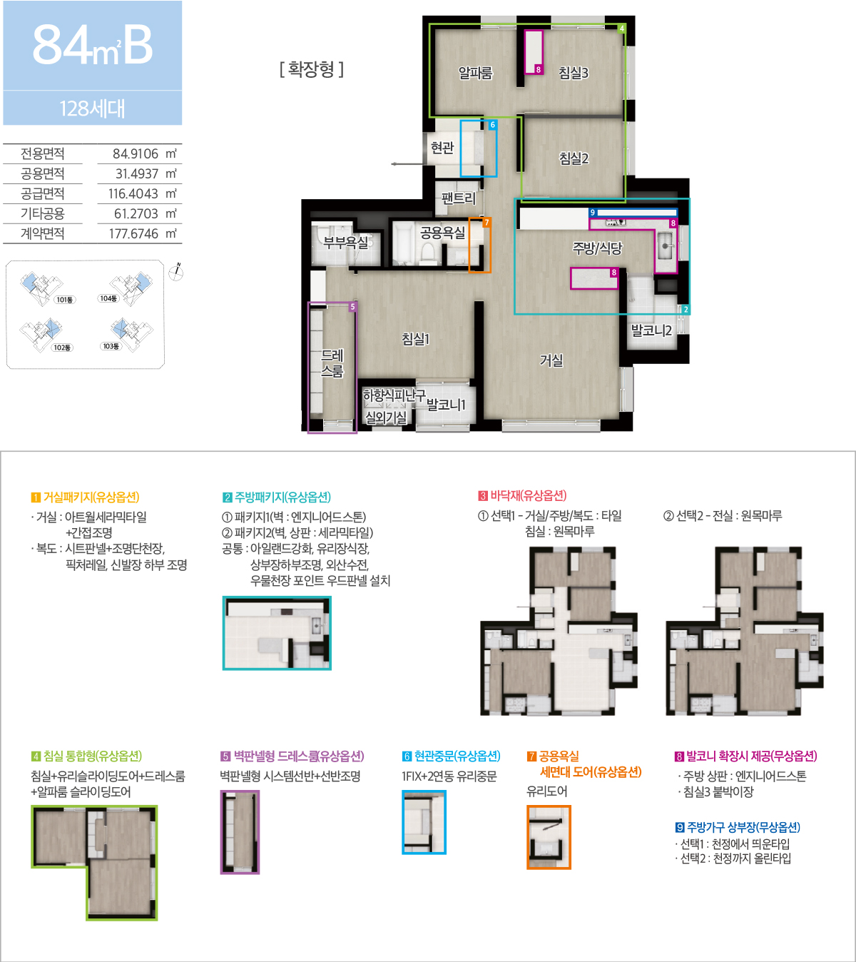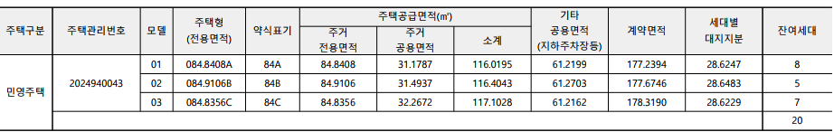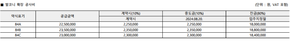 | 주택형 | 최저층 가격 - 최고층 가격 | 발코니 확장 | 잔여세대수 |