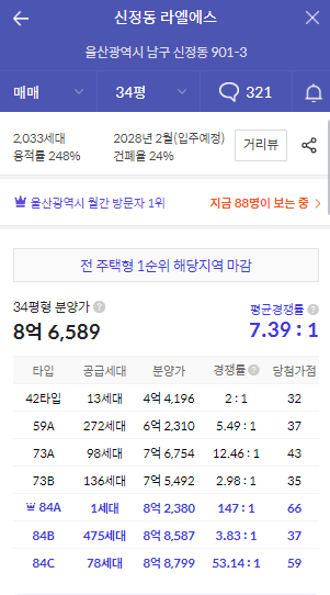 울산 라엘에스 34평 평균 분양가 8억 6589