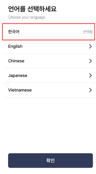3. 한국어 선택 후 하단에 확인을 누르고 다음 버튼을 누릅니다.