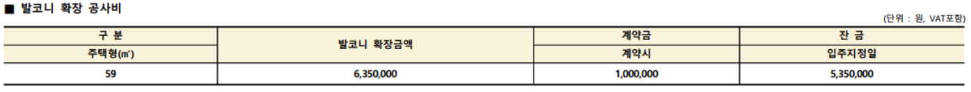 | 타입 | 최저층 가격 - 최고층 가격 | 발코니 확장 금액 | 공급세대수 |