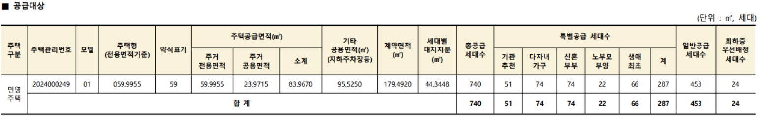 공급규모 : 아파트 지하 3층, 지상 25~28층 8개동 및 부대복리시설, 아파트 총 740세대 중 일반공급 453세대, 특별공급 287세대 [특별공급 세대(일반[기관추천]특별공급 51세대, 다자녀가구특별공급 74세대, 신혼부부특별공급 74세대, 노부모부양특별공급 22세대, 생애최초 66세대 포함)]