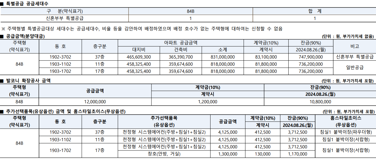 | 주택형 / 동호수 | 공급금액 | 발코니확장금액 | 추가선택품목 | 총 합계 |