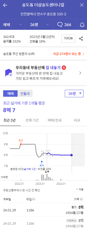 84 ㎡ 최근거래 24.01.29 8억 (27층)
