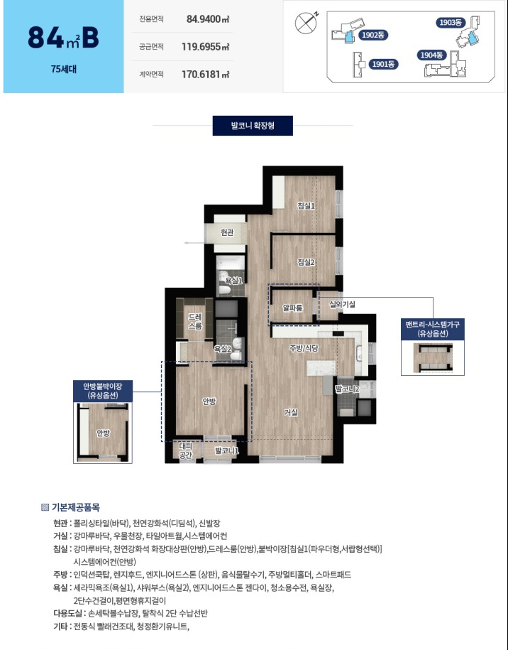 ※ 본 주택은 계약취소주택으로 최초 계약 당시 선택되었던 유상옵션(발코니 확장 및 추가선택품목)에 따라 시공 완료되었습니다. 따라서 시공 완료된 유상옵션을 모두 수락하는 조건으로만 공급계약 체결이 가능하오니, 정확히 확인하시고 청약 및 계약하시기 바랍니다(발코니 확장 및 추가선택품목의 추가, 변경, 취소 불가)