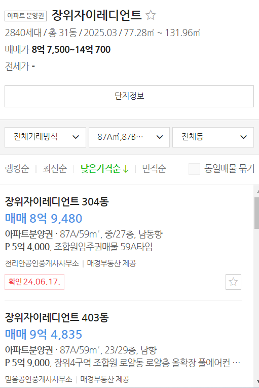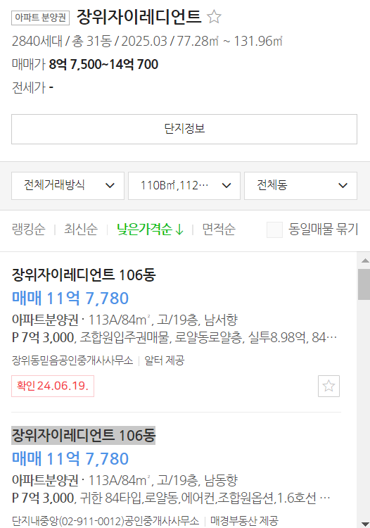 입주권 7억 2775(2층) 입주권 12억 1000(19층) |