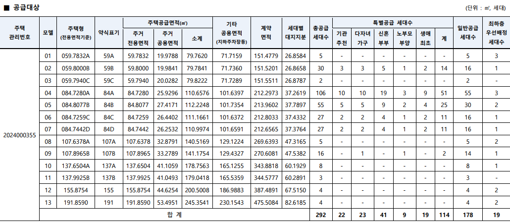 [특별공급 114세대(기관추천 22세대, 다자녀가구 23세대, 신혼부부 41세대, 노부모부양 9세대, 생애최초 19세대) 포함] 및 부대복리시설