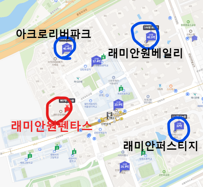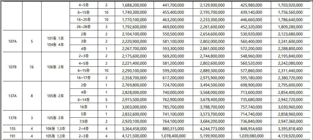 | 래미안원펜타스 | - | 59 ㎡ 1,647,900,000 - 1,746,100,000 84 ㎡ 2,101,300,000 - 2,333,100,000 107 ㎡ 2,654,600,000 - 2,975,900,000 137 ㎡ 3,494,500,000 - 3,788,700,000 |