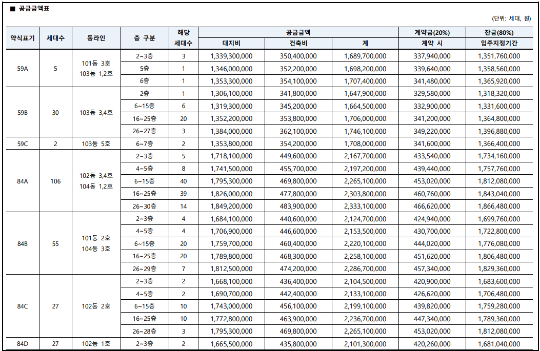 | 주택형 | 최저 가격 - 최고 가격 | 공급세대수 |