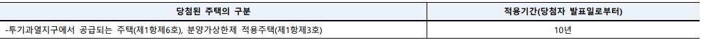 ※ 본 주택은 투기과열지구 및 청약과열지역에서 공급하는 아파트로 전매제한은 최초 당첨자발표일로부터 소유권이전등기일까지(3년)이나 [주택법 시행령] 제60조의2제1항제1호나목에 의거 3년의 거주의무기간이 해당되어 전매 또는 매매 시 규제대상임을 유의하시기 바랍니다.