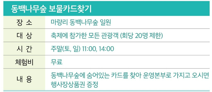내용: 동백나무숲에 숨어있는 카드를 찾아 운영본부로 가지고 오시면 행사장 상품권 증정