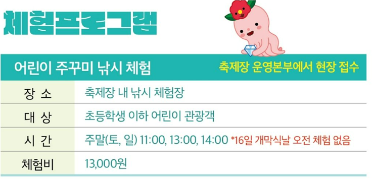 내용: 체험프로그램(어린이 주꾸미 낚시 체험, 선상낚시 체험 등), 상시행사(특산품 판매장), 캐릭터 포토존 등