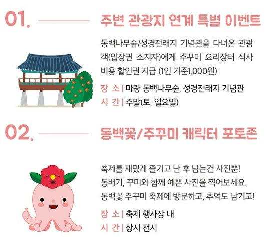 동백꽃과 주꾸미가 함께 하는 만큼 많은 볼거리와 먹거리가 있을 예정으로 많은 분들이 참여하셔서 즐거운 시간을
